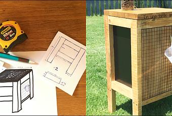 La parte de delante no me convencía mucho , porque la madera de contrachapado estaba bastante hecha polvo...así que cogí un trozo de tela de gallinero , lo pinté con el mismo spray negro y lo grapé en él.Encontré unos ganchitos por casa , los puse para poder poner el medidor de comida.En el medidor hice un agujero para que aguantara mejor.