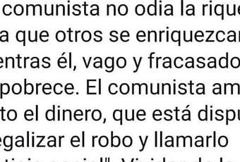 La Historia demuestra que de todos los sistemas posibles, el peor es el comunismo, que es el que gobierna hoy en países desgraciados como Cuba y Venezuela y está pugnando por apoderarse de España. Nadie ha matado y esclavizado tanto en este mundo como los comunistas.