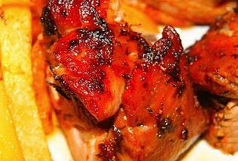 Mientras, preparamos la guarnición. Pelamos las patatas, las cortamos a la española, las freimos en abundante aceite caliente, las sacamos a papel absovente y las condimentamos con sal.