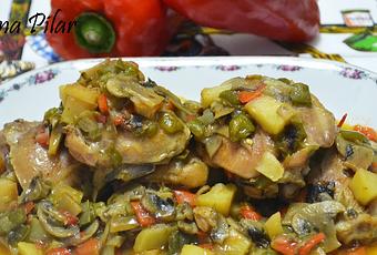- Salpimentamos los contramuslos y los doramos en una cazuela con aceite. Los retiramos y sofreímos la cebolla en el mismo aceite. Agregamos los pimientos y los champiñones, y lo rehogamos todo bien durante unos 5 minutos.
