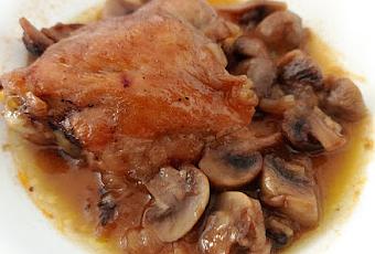 Mientras, en una sartén poner aceite del sobrante de freír el pollo, añadir los champiñones, los ajos picados y que se sofrían poco a poco, con una pizca de sal.Incorporar los champiñones a la cazuela y dejar cocinar 30 minutos a fuego bajo y tapado.Si la salsa ha quedado un poco líquida, se puede espesar mezclando una cucharada de maicena con un poco de agua, añadirlo antes de retirar el pollo del fuego. Remover para que se mezcle unos 3 minutos a fuego suave.Apartar la cazuela del fuego.Este guiso se puede preparar con antelación el día de antes.