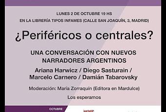 Mañana por la tarde, a las 19 horas, tendrá lugar la charla ¿Periféricos o centrales? Charla con nuevos autores argentinos, en la que participarán Ariana Harwicz, Diego Saturain, Marcelo Carnero y Damián Tabarovsky. La moderadora será la editora de Mardulce, María Zorraquín.Será en la librería Tipos Infames (C/ San Joaquín, 3 de Madrid).