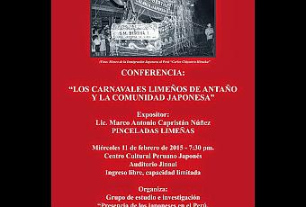 El Grupo de Estudio e Investigación "Presencia de los Japoneses en el Perú. Siglos XVII - XX", del Instituto Riva-Agüero de la Pontificia Universidad Católica del Perú, invita a asistir al conversatorio: "Los carnavales limeños de antaño y la comunidad japonesa", que contará con la participación del licenciado Marco Antonio Capristán Núñez, director del Blog Pinceladas Limeñas, el miércoles 11 de febrero a las 7:30 p.m. en el Auditorio Jinnai, del Centro Cultural Peruano Japonés (Av. Gregorio Escobedo 803, Jesús María).