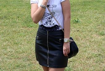 !Buenas noches! ¿Cómo ha ido el finde? Espero que genial, aunque a mi se me ha pasado volando y no he podido hacer todo lo que quería hacer. Este sábado aprovechando que hacía un día genial, me puse un camiseta blanca de manga corta con un dibujo de un vestido que combiné con mi falda de piel negra y como quería ir cómoda me puse mis converse y un bolso negro cruzado. El resultado? Un look casual chic perfecto para hacer mil recados por la ciudad.