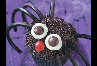 Con el frosting de vainilla haga los ojos de la araña y colocar 2 mini caramelos cafes para las pupilas. Corte trozos de cordones de regaliz negro y coloque a los lados del mini cupcake para formar las patas.