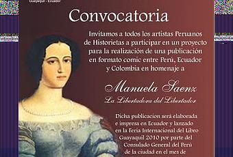 Hacemos una invitacion formal a todos los dibujantes e ilustradores peruanos para que participen en un proyecto sobre una publicacion trinacional del noveno arte (Peru, Ecuador y Colombia). El Consulado General del Peru en Guayaquil, el Comic Club de Guayaquil, La Muestra de Comic Pereira y el Cine Club Borges buscan a un talento peruano en comics para formar parte de un homenaje a MANUELA SAENZ, la libertadora del libertador, realizando una historieta sobre ella que será publicada en un libro trinacional desarrollado por el Consulado del Peru y lanzado en el mes de Julio del 2010 en el evento Feria Internacional del Libro Guayaquil 2010.