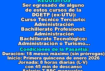 🎓 Requisitos ExcluyentesSer ciudadano natural o legal (con 3 años de antigüedad de la carta de ciudadanía)Tener mínimo 18 años al cierre de la inscripciónSer egresado de alguno de estos cursos de la DGETP (ex-UTU):Curso Técnico Terciario: AdministraciónBachillerato Profesional: AdministraciónBachillerato Tecnológico: Administración o TurismoNo haber tenido beca o pasantía previa en el EstadoNo tener cargo público remunerado al momento de la contratación (excepto docencia)