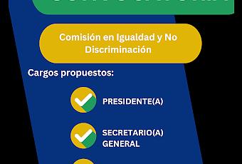 Si te interesa postular o nominar a los próximos integrantes de la Comisión en Igualdad y No Discriminación! 🙍♂️🙍♀️ , puedes hacerlo enviando un mensaje acompañdo de unas líneas sobre plan de trabajo, cv y 1 foto personal, a a nuestra cuenta de correo corporativa: [email protected].