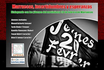Libia y la terrible represión en sitios como Bahréin, Yemen y sobre todo Libia. Marruecos no ha sido ajeno a este despertar. El movimiento 20 de Febrero, con tantos puntos en común con nuestro movimiento 15M, ha protagonizado enormes movilizaciones y sufrido la represión de un régimen inmovilista que controla todos los resortes del poder y la economía. Hace unos días con nuevas movilizaciones el movimiento 20 de Febrero ha rechazado la reforma maquillaje de la Constitución del Rey. Desde la APDHA (Asociación pro derechos humanos de Andalucía) se han organizado tres ciclos de mesas redondas con ellos para conseguir que pueda asistir el máximo número de personas interesadas.