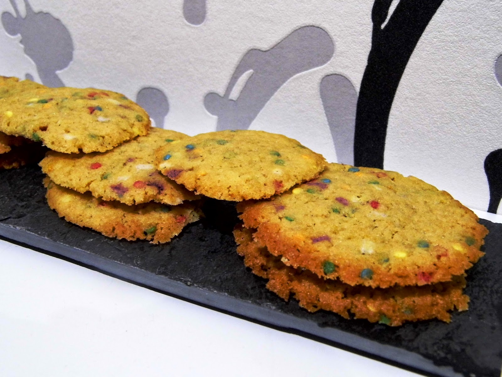 150gr de mantequilla pomada1 huevo50gr de azúcar de caña (Moreno)50gr de azúcar blanco1/4 cucharadita de bicarbonato sódico125gr de harina40 gr de confeti para decorar (Comestible jajaja) Batimos la mantequilla con el azúcar y el huevo y poco a poco vamos echando el resto sin dejar de batir, el confeti al final Refrigeramos la masa como mínimo una hora Precalentamos el horno a 180º Hacemos bolitas del tamaño de una cuchara, yo las aplaste un poco pero a la próxima no lo haré ya que se bajan mucho con el calor del horno. También tened en cuenta de dejar separación entre ellas Horneamos unos 12 minutos o hasta que se doren. Cuando las saquemos estarán blandas, dejamos templar la bandeja del horno un poco antes de pasarlas a una rejilla.