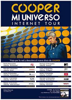 Así pues, para tan especial ocasión, la gira de presentación va a ser totalmente diferente. “Internet Tour” será la presentación de las nuevas composiciones de COOPER. A lo largo de diez días, en diez portales de internet diferentes, se irán presentando las diez canciones que componen este disco, cada una con un video-clip nuevo hecho para la ocasión. Así pues, desde el 8 de noviembre, podremos descubrir, cada día en una dirección web diferente, las nuevas composiciones de Alex Díez, con unos maravillosos videos que nos transportarán a los universos propios de cada canción, además de desvelarnos algunos momentos de la grabación del disco en los míticos estudios británicos. La fecha de salida de “Mi Universo” es el 21 de noviembre.