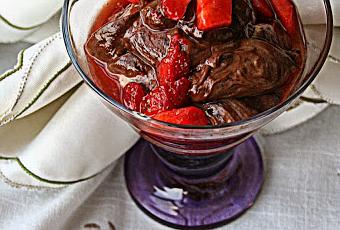 En una copa ponemos las fresas maceradas con el vino,encima la crema de chocolate y finalizamos con una cucharada de fresas y el vino.