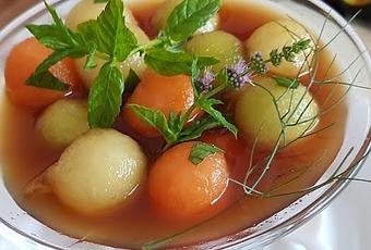 Con estos calores apetecen poco cocinar, por el contrario apetecen mucho cositas refrescantes. Mi receta de hoy cumple las dos premisas, apenas necesita cocción y se toma fresquita, es además una fruta con un alto poder hidratante por lo que va perfecta para estos días. Por otro lado es una fruta que está de plena temporada, por lo que en estos momentos nos ofrece el mejor sabor, y debería también coincidir con el mejor precio, pero de eso mejor no hablamos porque está todo por las nubes.La elaboración es de lo más sencilla, en el fuego solo se hace el almíbar, lo demás es solo entretenerse un ratito haciendo bolitas con la pulpa de los melones, dejar un buen rato en a nevera y a disfrutar de una delicioso y fresco postre.
