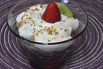 Agregarle el yogur, una cucharada de sirope de agave por encima. Decorar con la misma fruta y espolvorear con polen.