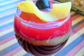 3. Montamos las copas colocando el pudding de chocolate en el fondo, la mermelada de piña y de ciruela encima. Servimos con láminas de piña asada a la plancha.