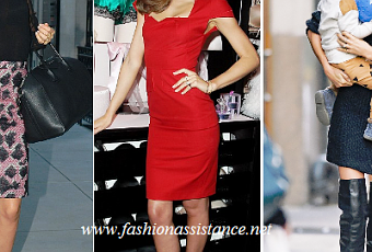 En la primera imagen, Miranda Kerr lleva un top negro con mangas transparentes, de Phillip Lim, falda estampada en negro y rosa imitando serpiente, por encima de la rodilla, de Balenciaga, que combinó con zapatos de Lanvin, Resort 2012 y bolso xl de de Givenchy. El vestido rojo de la segunda fotografía es un diseño de Roland Mouret. El minivestido negro de corte casi trapecio, está magistralmente combinado con unas botas de Hermès, Otoño 2012.