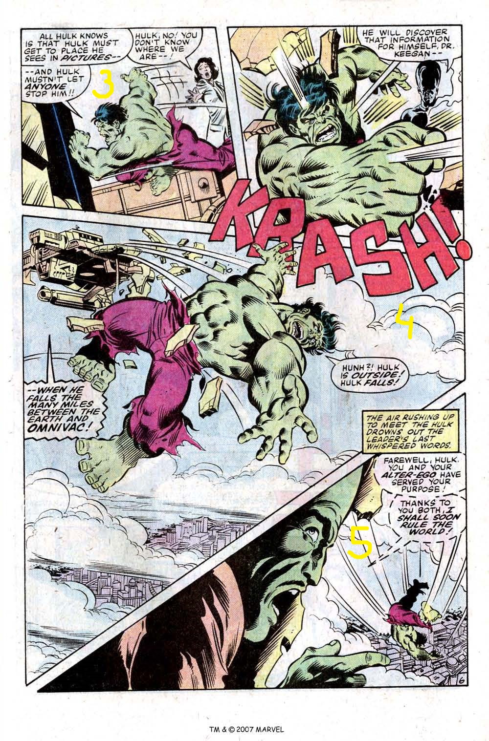 Bendis y Coipel:La escena de Bendis para mi es memorable. Es decir, se me ha quedado grabada. Es el mejor ejemplo de lo lamentable que es como guionista. Cierto es questá siguiendo el estilo jolibudiense moderno de guionizar, que es una mierda. Lo 1º que se ve en la escena es que prima la espectacularidad sobre cualquier cosa. Lo 2º es que es bastante potente como metáfora. Así que superficialmente o instintivamente la cosa es notable. Pero es absurdo. Un tipo duro recibe una revelación y lo siguiente que se le ocurre es lanzarse al vacío??? A ver, que no es que la iluminación le haya hecho concluir que lo que mejor puede hacer es suicidarse. La revelación puede desorientar pero eso no lleva a hacer algo estúpido, mucho menos a tipos duros que miran tanto a la Muerte como al Abismo todos los días. Y además estamos en una situación en que Lobezno podía haber caminado, cogido un vehículo aéreo y volado dallí sin problemas. Un descenso con 2 dedos de frente. Esto es lo que me ha alejado de lo comercial yanki. No puedo cuando se pone lo espectacular sobre lo razonable. Y no confundamos esto. Lo razonable no es lo contrario de lo fantástico. La mayoría de las locuras son impecablemente lógicas. Por eso son difíciles de curar. Cuando un guionista hace una memez así no me gusta porque pienso que no me está respetando y porque me deja claro que no le dedicó el tiempo necesario para hacer SU trabajo bien. No dedicó tiempo a pensar algo mejor que la 1ª chorrada que se le ocurrió. No quiso ni superarse ni hacer las cosas correctamente. En fin, como veis el odio a Bendis me mantiene caliente (hay algo más humano que odiar al que se considera que no se merece su triunfo??). Por eso me llamó mucho la atención el anual 11 de Hulk. Fijaos en las viñetas numeradas. Creo que es bastante probable que a Bendis se le quedase grabado la escena ideada por Mantlo y Buckler. Parece que al calvo le impactó ese momento porque ha repetido otras veces el que un personaje tenga una revelación y luego se tire desde gran altura.Viñeta 1: revelación.Viñeta 2: desorientación.Viñeta 3: necesidad perentoria de salir.Viñeta 4: caerse en el caso de Hulk; tirarse en el caso de Lobezno.Viñeta 5: caída.Creo que tengo bastantes posibilidades de acertar el nº. En la mediocre historia de Mantlo, Banner se ha autosugiestionado para recordar algo cuando se convierta en Hulk. Así, cuando estando en esa forma recibe a modo de flash ese recuerdo, lentran unas ganas tremendas de ir allí por lo que se encamina hacia ese lugar cayendo porque ignoraba questaba en una aeronave. En la mediocre historia de Bendis, Lobezno recuerda de repente como era el mundo ayer así que se asusta porque es muy diferente al de hoy por lo que decide tirarse. Parece que pensaba que podía sobrevivir a la caída. En fin, se mire como se mire estas 2 escenas se parecen un huevo. No? La diferencia es que lo de Mantlo es razonable y sensato y lo de Bendis una mierda.