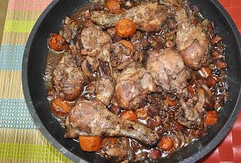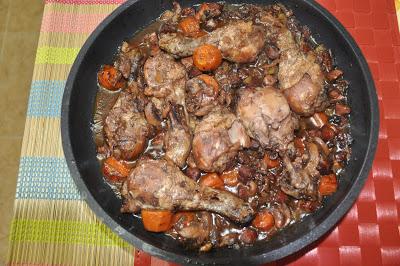 Se trata de un estofado de pollo en el cual se añade una gran cantidad de vino (generalmente el vino utilizado es tinto pero a veces se utiliza el blanco).