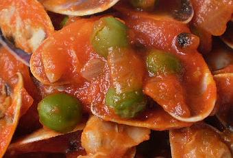 Agregar las coquinas, los guisantes, cuatro o cinco granos de pimienta negra, dos o tres hojas de laurel y un chorreoncito de vino blanco (uso un fino de Montilla Moriles) a la cacerolita del tomate frito, llevándolo a ebullición durante unos minutos, los suficientes para que las coquinas se abran. Remover y listo para disfrutar.