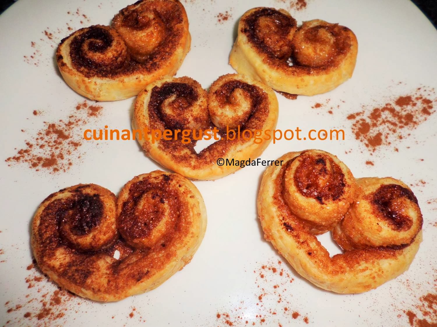 Ingredientes (para unos 16-18 corazones):1 lámina de hojaldreUn poco de mantequilla100 gr. de azúcar moreno1 cucharadita colmada de canela molidaCanela para espolvorearElaboración: