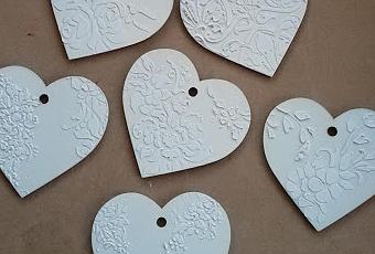 Una vez pintados los 6 corazones a los gris clarito, los de la derecha de la foto, les he puesto pasta Distress que me encanta el acabado que dá. La pongo con pincel y luego paso un pañito retirando el exceso. Mexclada con el gris claro, dá como un acabado piedra muy chulo¡