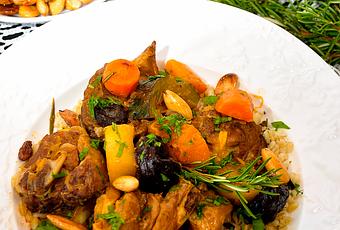 Servimos una ración de trigo en el fondo del plato y ponemos unos trozos de carne con verduras sobre él y añadiremos un poco de la salsa que tenemos del guiso.