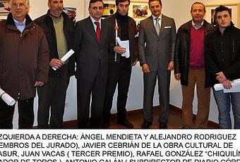 En la sala de exposiciones de Cajasur (calle Reyes católicos) ha quedado abierta la exposición de fotografía Taurina del XI Certamen. En dicho acto de inauguración, se procedió a la entrega de premios a los galardonados. Javier Cebrián, de la Obra Social y Cultural de Cajasur, entregó el primer premio, que recayó en Javier José Viciano Ferrández, de Onda (Castellón), En su nombre lo recogió Ángel Mendieta, miembro del Jurado. Antonio Galán, subdirector de diario CÓRDOBA, entregó a Rafael Becerra el premio al Mejor Autor Andaluz. Por su parte, el matador de toros Rafael González "Chiquilín" entregó a Juan Vacas el premio La Montera al Mejor Autor Provincial y Alejandro Rodríguez, miembro del Jurado recogió, en nombre de Gorka Azpilicueta, de Navarra, la Mención Especial del Jurado. La exposición estará abierta al público hasta el próximo día 26 de Febrero.