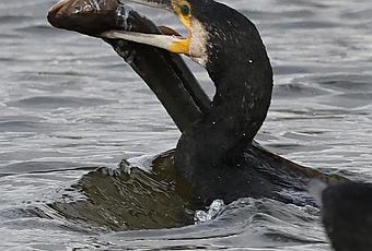El cormorán grande es un experto pescador. Con su aguda vista bajo el agua y su agilidad al nadar, puede detectar y capturar peces que a menudo igualan la longitud de su cuello. En esta ocasión, la presa representaba no solo una gran recompensa, sino también un desafío. Tragar una anguila tan grande requería maniobras cuidadosas y, al mismo tiempo, el ave tuvo que defender su botín de otros cormoranes que rápidamente se acercaron, tratando de arrebatarle su captura.