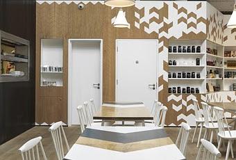 In a former munitions warehouse in London, Paul Crofts Studio has designed a cafe following the same industrial aesthetic and trying to keep a reference about the origins creating a chevron pattern that remembers the militar insignia. The most atractive part is the tessellating using wood and white tiles that has been used in some places, the same patern in different scale is in the tables and in the lamps shape.