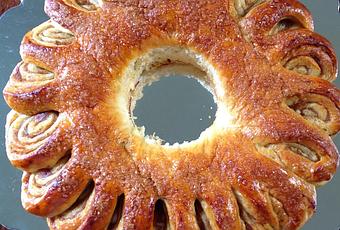 Cubrimos con un paño y dejamos levar de 45 a 60 minutos en un lugar cálido y sin corrientes. Mientras ponemos el horno a calentar a 175 grados, calor arriba y abajo. Los recortes que obtuvimos antes al cortar los bordes de nuestro cilindro, los enrollamos y colocamos en una flanera o molde pequeño para hornearlos también. Pintamos la corona y los recortes con el huevo batido y agua y espolvoreamos el azúcar demenara por encima. Horneamos durante 25 minutos aproximadamente o hasta que la veamos dorada. Un poquito antes habrá que sacar las flaneras con los recortes.