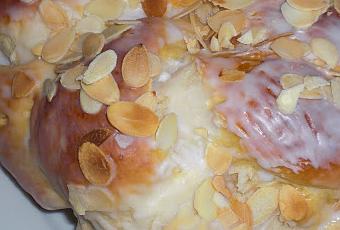 Coloca la corona sobre un papel para hornear. En un recipiente se mezclan los ingredientes de la cobertura: Yema, y una cucharada de leche, con una brocha se barniza la masa y se cubre con las láminas de almendra.