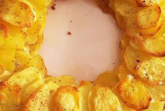 Forma un círculo con las patatas de forma que se superponga una encima de la siguiente, añade un poco de pimienta y trocitos de manteca, forma otro circulo encima del primero, repite la operación hasta acabar con todas las patatas, pon pimienta y manteca en cada capa. Debes tener un mínimo de 4 capas.