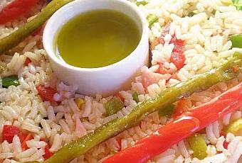 ** La salsa de vinagreta que añadimos a la mezcla del arroz es para que una vez desmoldemos la ensalada de arroz esta no se desmorone, el aceite de la vinagreta hace de “argamasa” que mantiene los ingredientes juntos.