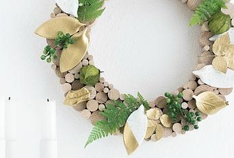 Ahora tenemos que pegar las hojas y frutos naturales junto con las creadas con arcilla polimérica alrededor de la corona.