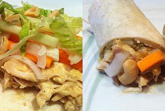 Ingredientes para 4 personas:4 cucharadas de postre de curry2 cucharadas de postre de mermelada de albaricoques6 cucharadas de postre de mayonesa Medio yogurt natural500 g de pollo asado.5 orejones (picados)Un puñado de anacardos (o almendra laminada)AceiteSalPimientaSalsa Perrins (Salsa Worcestershire)Cebolla, zanahoria y ensalada8 fajitasDesmenuzamos las sobras del pollo al ast en trocitos, en nuestro caso fueron 2 pechugas grandes.En un bol mezclamos el medio yogurt, la mermelada de albaricoque, la mayonesa, el curry y los orejones picados. Mezclamos bien toda la salsa y añadimos el pollo.Salpimentamos la mezcla y añadimos un buen chorro de salsa Perrins. Probar y ajustar al gusto (más curry y pimienta para un sabor más intenso o más yogurt si se quiere un poco más suave) Dejar enfriar y lo servimos en una fajita con cebolla en juliana, zanahoria en palitos y la ensalada picada.Noe y David