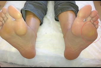 Aquí muestro un fotografia donde se observa que el pie derecho operado ha desaparecido practicamente el callo. El pie izquierdo esta pendiente de cirugía todavía.