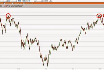 - En el gráfico de cinco años podemos comprobar como el Ibex35 ha fallado hasta en tres ocasiones tras llegar a la cota de los 11.200 puntos.