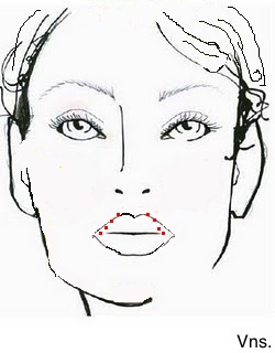 Según sus salientes:- Labio superior prominente: Acortamos el contorno del labio superior con una linea horizontal, además aplicamos corrector de tono oscuro o medio.