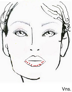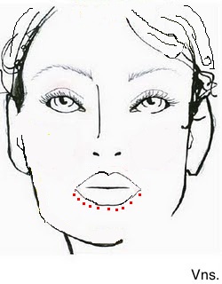 - Labio inferior prominente: Acortamos el contorno del labio inferior en su zona central y elevamos la linea hacia la comisura. Volvemos aplicar corrector oscuro o de tono medio.