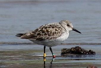 David y Juan han escrito al responsable de los programas de anillamiento, Jeroen Reneerkens, que ya nos ha contestado. Nos dice que el correlimos probablemente corresponde a su programa, pero que ha perdido uno de los distintivos, la banderola (flag) de color; esto parece ser un problema creciente en estos programas de anillamiento.