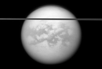 Genial imagen proporcionada por la sonda Cassini en donde podemos ver como los anillos, situados en el plano casi perfecto de la posición de la sonda, cortan por su parte superior la brumosa luna Titán - de 5150 km de diámetro, el mayor satélite del planeta Saturno. La imagen la tomó la cámara de ángulo estrecho a bordo de la Cassini el pasado 12 de mayo de 2011 desde una distancia de 2,3 millones de kilómetros del satélite. Foto: CICLOPS. Clic para ampliar.