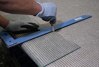Con la marca hecha, situamos el cristal en el filo de la mesa, para que al presionarlo con las manos se quiebre por la línea. Siempre con guantes. Para ayudar al inicio del corte, podemos dar un ligero golpe con el corta vidrios por abajo, en el borde del cristal.