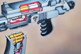 Se trata de una ilustración en forma de corte transversal "técnico" de un Bolter de Marines Espacial del RT (De los primeros que salieron como tales,que tenían el cargador curvo y justo detrás del cañón),para mostrar sus mecanismos. Es obra de un artista que firmaba como H. Lo publico 1987, siendo de las primeras ilustraciones del juego y esta realizado con una técnica mixta de rotring y gouache. Su tamaño esta clasificado como "tbc", es decir, que no esta confirmado su tamaño original. tbc es la abreviatura de "to be confirmed".
