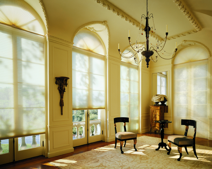 cómo podía tapar un par de ventanales en forma de arco que tiene en su casa, con cortina, estor,..