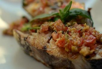 Ahora calienta bien la plancha o sartén con unas gotitas de aceite y pones las rodajas de corvina a dorar, unos 4 minutos por lado, que queden bien tostaditas. Sirve las rodajas con una generosa ración de vinagreta por encima, verás que maravilla!! Acompaña con un buen vino blanco joven bien frio y una ensalada verde.