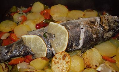 Pela y enjuaga las patatas, escurre y párteas a rodajas. Pela y corta la cebolla en juliana, los pimientos en trozos alargados. Ponlo todo en una fuente de horno, echa sal al gusto, el perejil picado y rocía con AOVE . Introduce en el horno a 180º, calor arriba y abajo durante unos 20 minutos. Cuando las patatas estén casi tiernas y vayan tomando color dorado, coloca el pescado encima . El pescado estará libre de escamas, sin tripas, es decir, bien limpio ( puedes pedir al pescadero que realice este trabajo , algo que te ahorras y seguro que lo hará con gusto ).Yo hago al pescado unos cortes transversales y pongo unas rodajas de limón. Pon sal al pescado. Agrega también un poco de aceite por encima de él para que no se reseque.