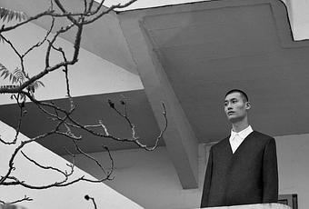 “El vestido-columna asimétrico explora la funcionalidad a través de cintas ajustables, es una silueta elegante reformulada desde un dibujo original de técnicas de la Bauhaus” .