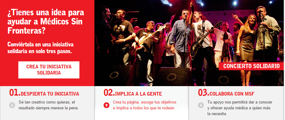 - Página "Iniciativas solidarias" de Médicos sin Fronteras. Desde aquí, facilitan información para crear eventos solidarios en los que los fondos recaudados vayan a beneficio de MSF. Es bonito, te facilita las cosas, y es una buenísima causa.