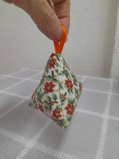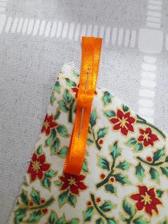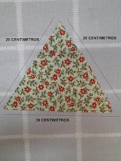 dibujamos un triángulo en la tela, los 3 lados deben medir 0,20cms. y lo mismo en entretela que pegamos a la tela para reforzarla
