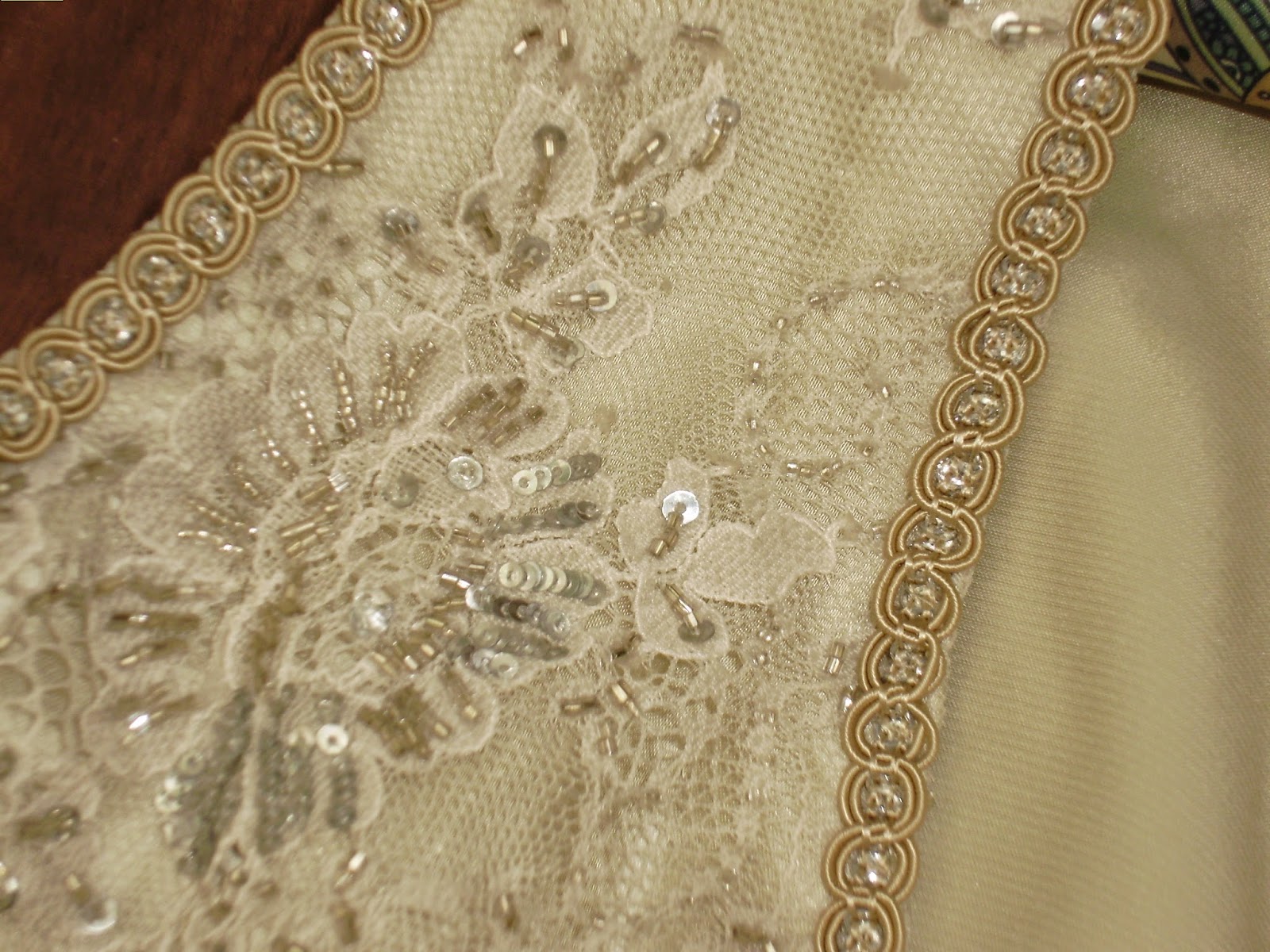 Cuánta ilusión y cuántos días cosiendo para la boda, un día tannnnnnnnnnn esperado y realmente un día vivido tan intesentamente que se pasó volando.A Eva, la novia de mi hijo le hice un vestido de encaje chantilly con cristalitos forrado de satén fino en tono beige oscuro, rematado con pasamanería de seda en el escote y las sisas